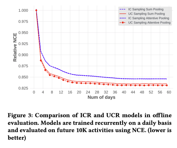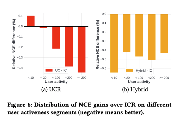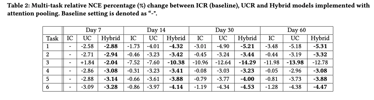 full-scale production dataにおいてアーキテクチャを変更することなく、数日間のトレーニングデータを用いてUCRモデルを学習したところ、本番のICRモデルと比較してNCEで最大0.6%の向上が観察された
