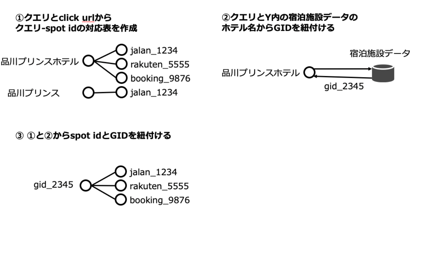 (クエリ, URL(spot id)) と (拠点名, gid (Yの拠点DBのid)) を クエリと拠点名でjoinして、spot idとgidを結びつける