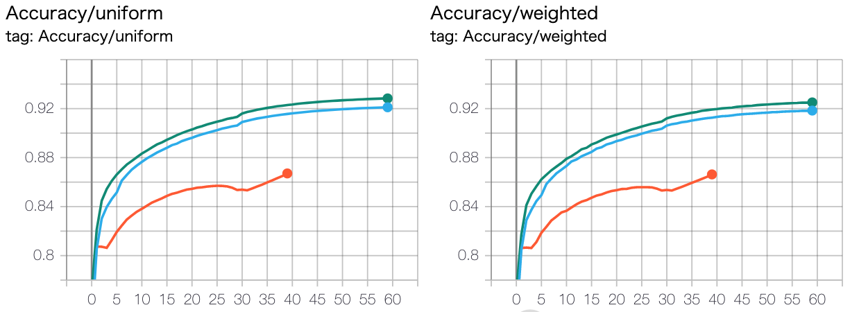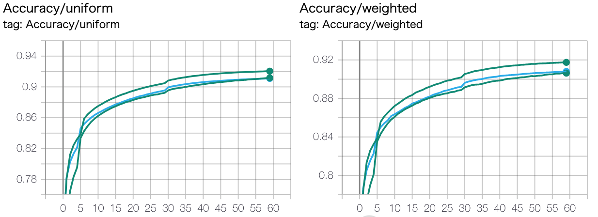 一番上の緑: 7000step (約2epoch) までの間0から1e-3まで線形にあげていって、 その後はstepごとに学習率を0.99998倍していく (最小の学習率は1e-5)