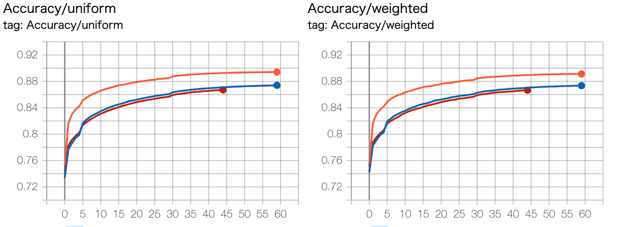 水色: 1e-3からはじめてstepごとに学習率を0.99998倍していく (最小の学習率は1e-5) (warmupなし)